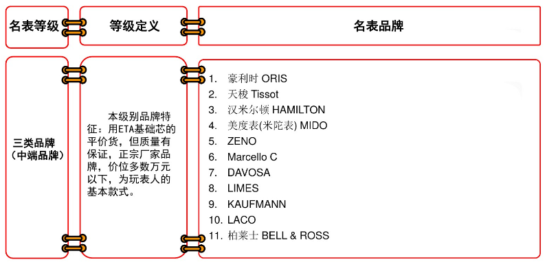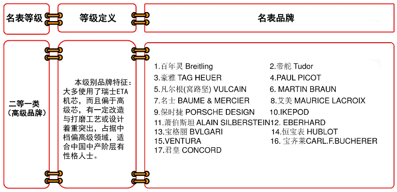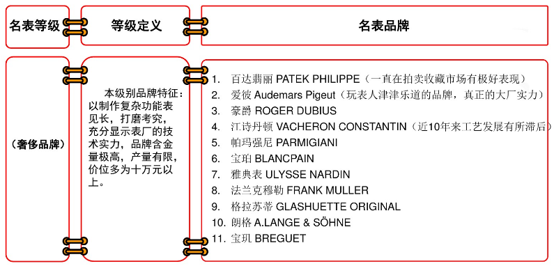 由創(chuàng)立的瑞士手表品牌,堅(jiān)持“專(zhuān)業(yè)手工定制”,打造精致而有意義的精品手表。手表背面會(huì)刻上制造商的名字,以示責(zé)任和保證,品牌理念是“駕馭常規(guī),創(chuàng)造創(chuàng)新”。手表品牌等級(jí)梯形圖。