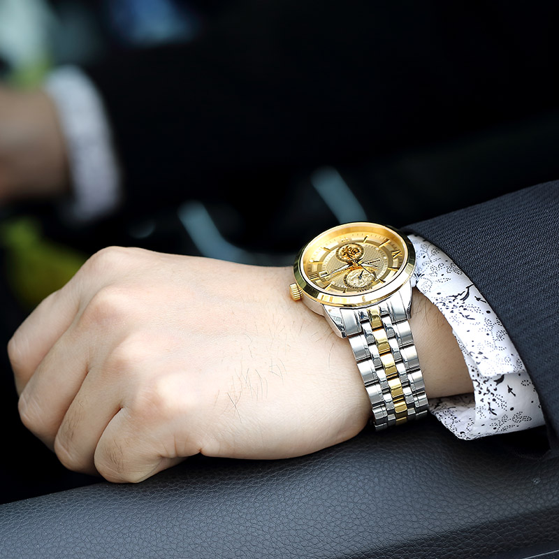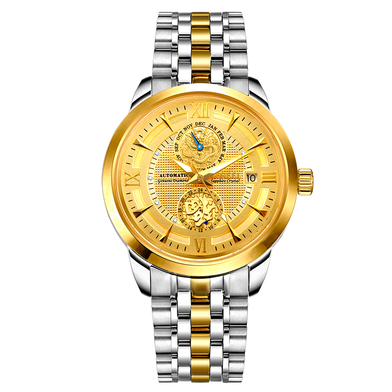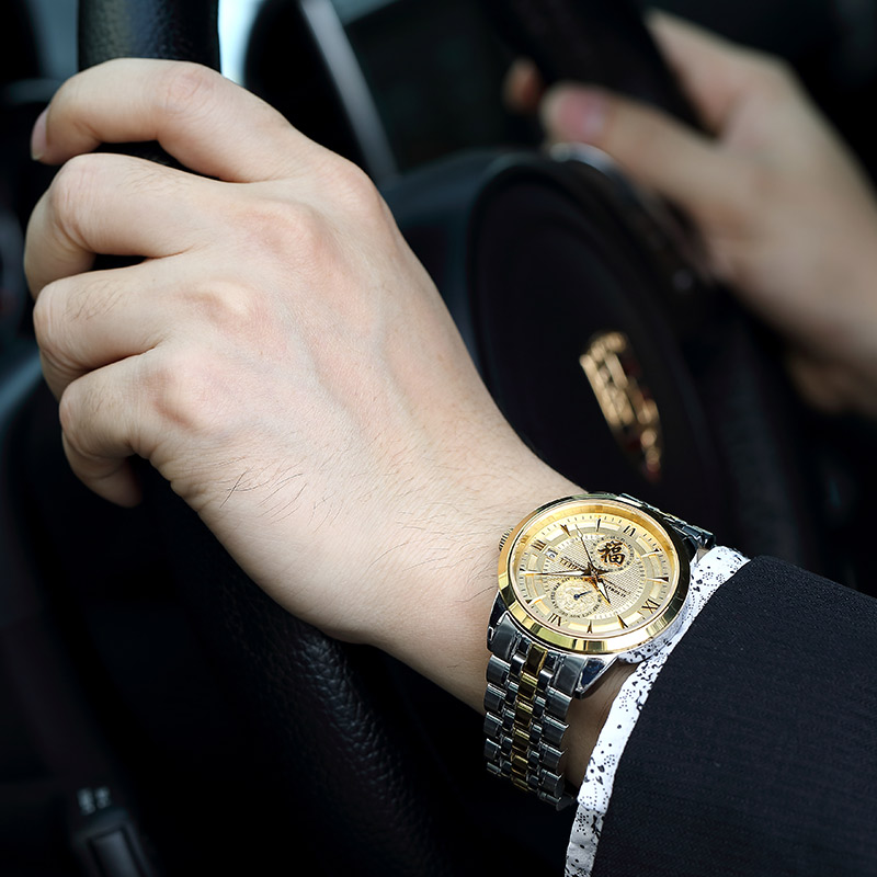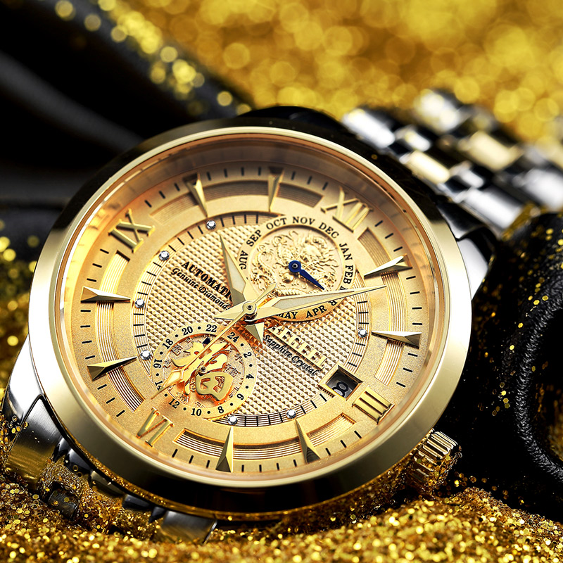 電鍍真金,不易褪色,極盡奢華。表盤(pán)里鑲嵌7顆天然真鉆,全自動(dòng)機(jī)械機(jī)芯,“福”字設(shè)計(jì),隨著時(shí)間轉(zhuǎn)動(dòng)而轉(zhuǎn),讓源源不斷的福運(yùn)每分每秒陪伴在您的腕間。