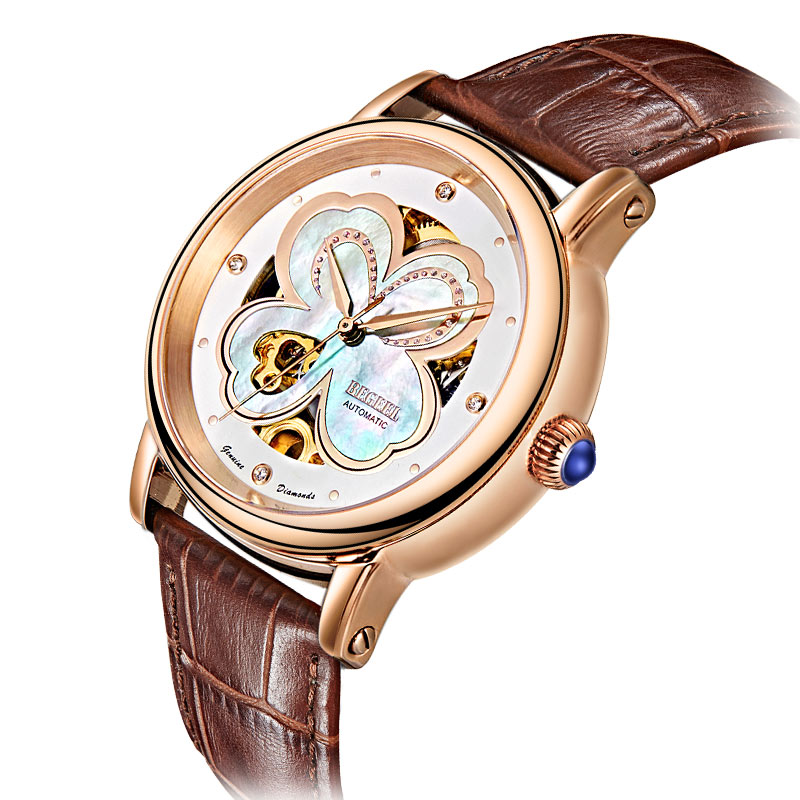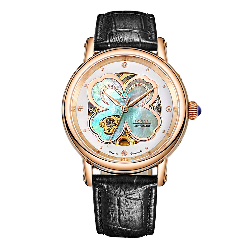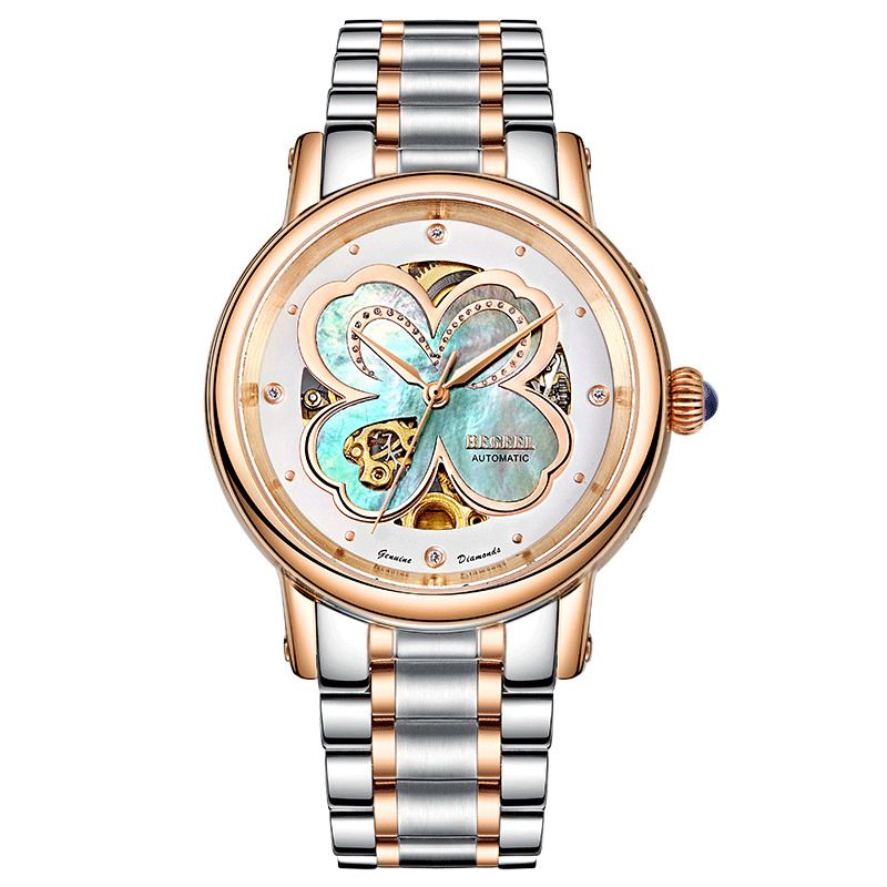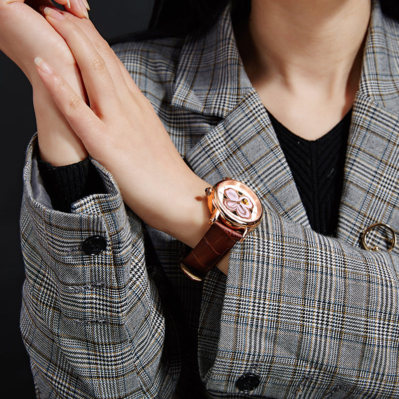 傳說(shuō)中的四葉草(Clover)是夏娃從天國(guó)伊甸園帶到大地上的珍寶,花語(yǔ)是幸福。四葉草的四片葉瓣分別代表著:希望(hope)、信心(faith)、愛(ài)情(love)和幸運(yùn)(luck),找到了“四葉草”,也就擁有了幸福。賓爵設(shè)計(jì)師將這美麗的傳說(shuō)鐫刻表盤,傳遞美與幸福。純凈珍珠母貝表盤采用了鏤空設(shè)計(jì),玫瑰金色靈動(dòng)曲線與晶鉆交匯勾勒出四葉草的葉瓣,設(shè)計(jì)師特別在第三片葉瓣中鏤雕出精美的心形,暗合其美好的愛(ài)情寓意,匠心巧思,可見(jiàn)一斑;隨著光線和角度的變幻,珍珠母貝呈現(xiàn)出不同的光影,金色機(jī)芯若隱若現(xiàn),炫彩動(dòng)人,美輪美奐。