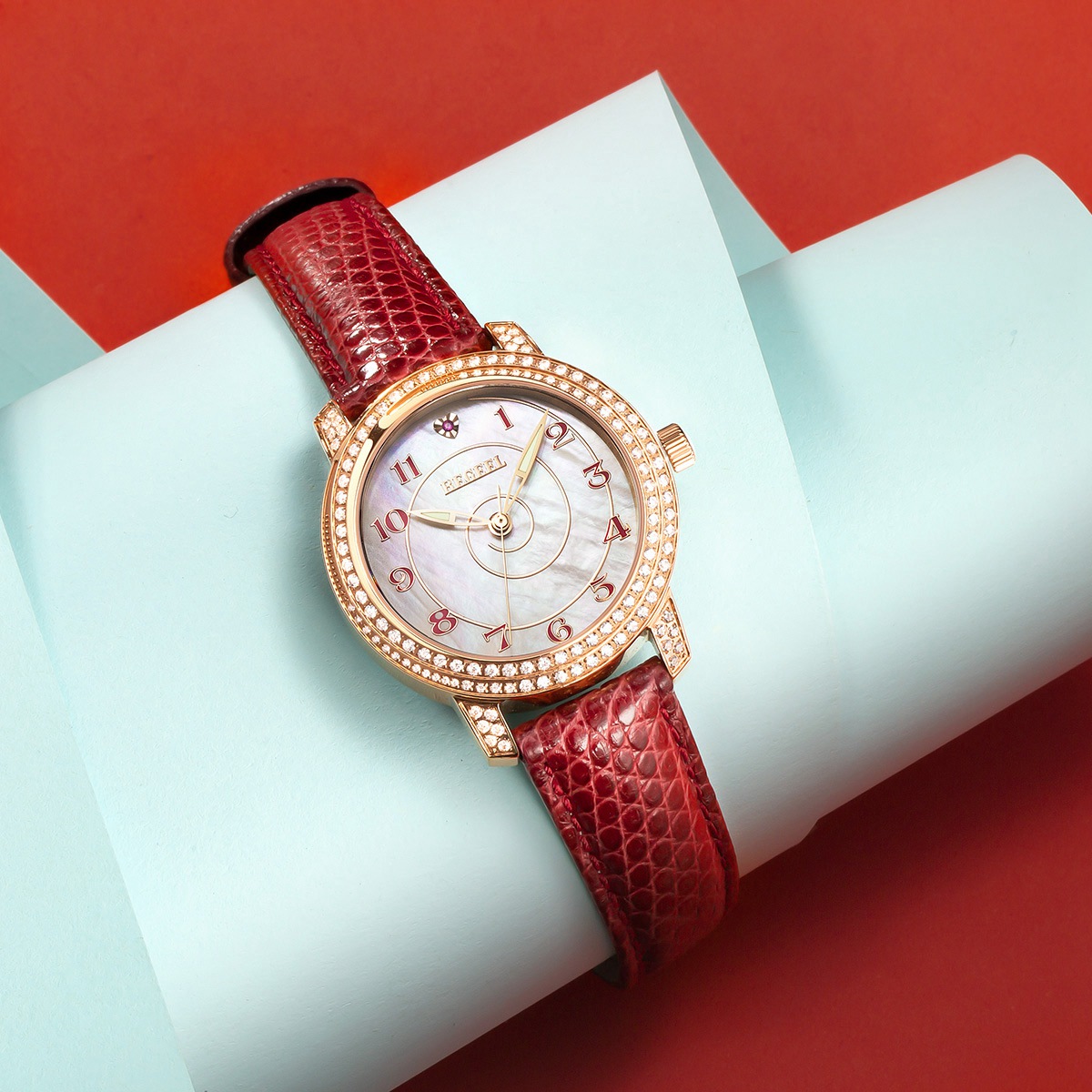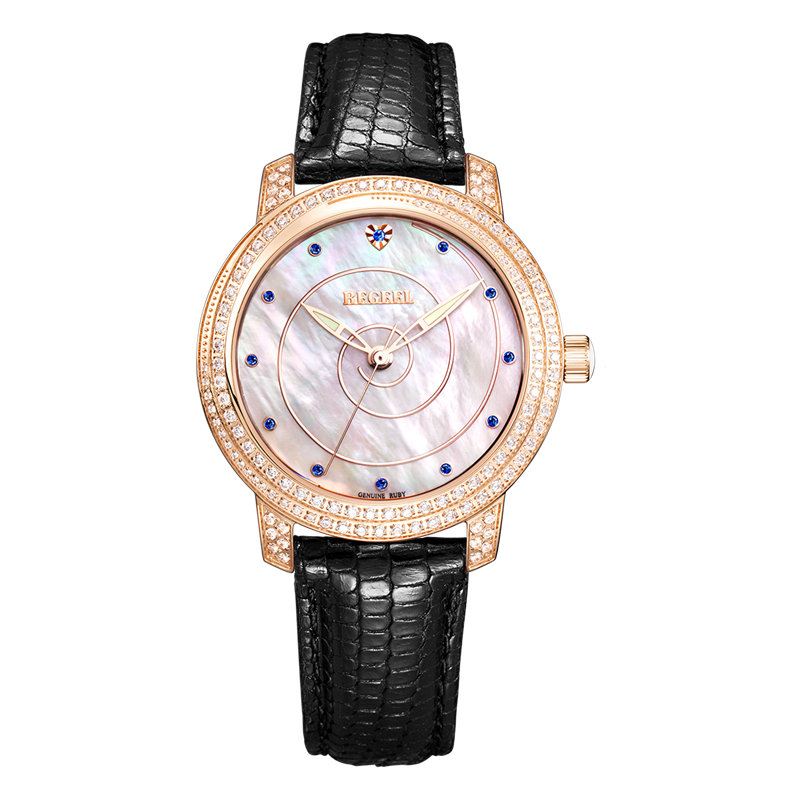COLLECTION·珍藏系列-靈感來源于藝術體操中飛舞的絲帶,時而柔美時而輕盈飄逸,以螺旋概念為設計主題,運用鉆石、珍珠貝母,由表面中間向外旋轉布陣,表殼鑲100粒水鉆,配襯紅色寶石時刻,藍色阿拉伯數(shù)字刻度,用絲帶的婉約去碰撞珍珠母貝與滿天星水鉆,鉆石形成的螺旋形圖案更加矚目。優(yōu)雅風范,展現(xiàn)女性柔美。