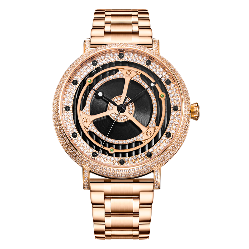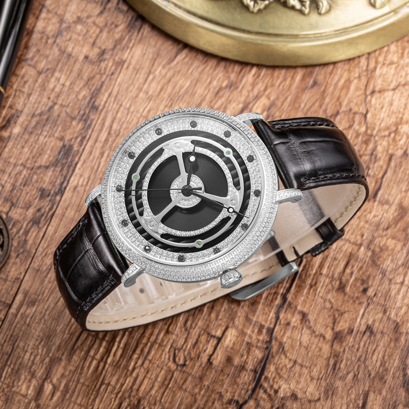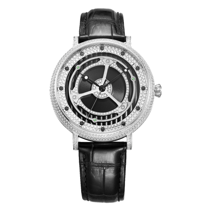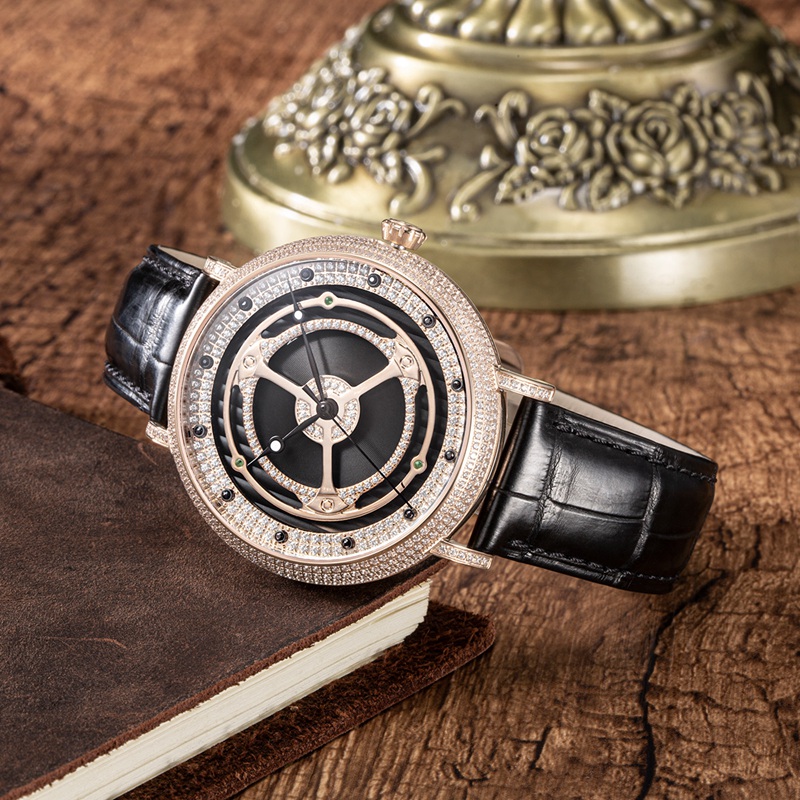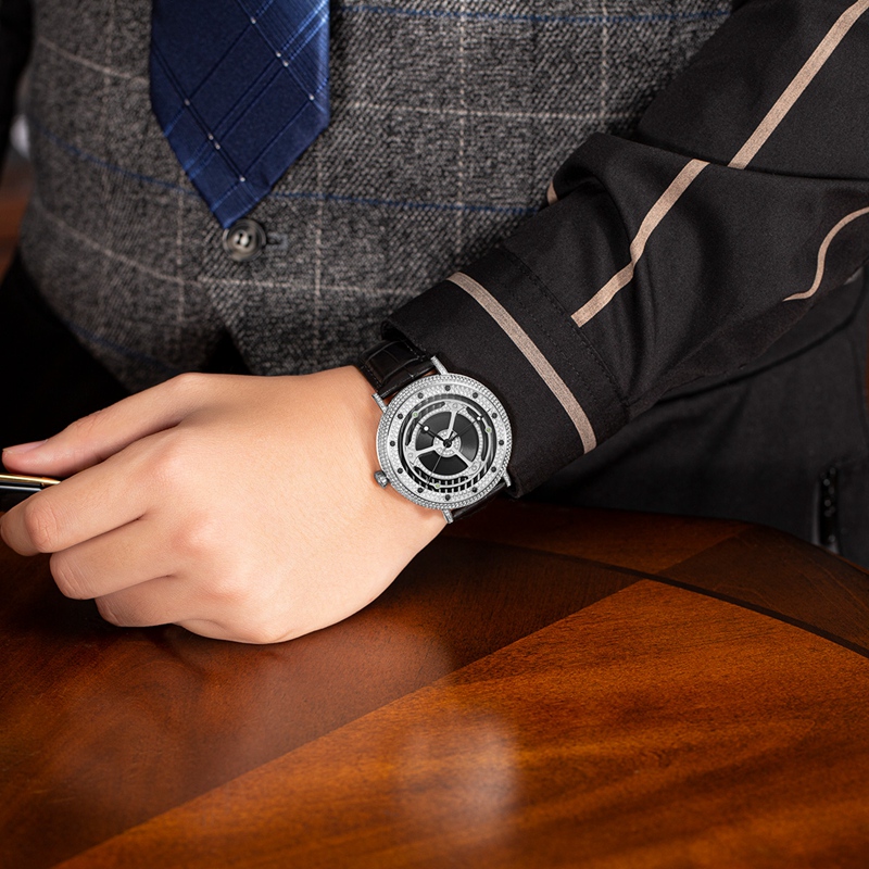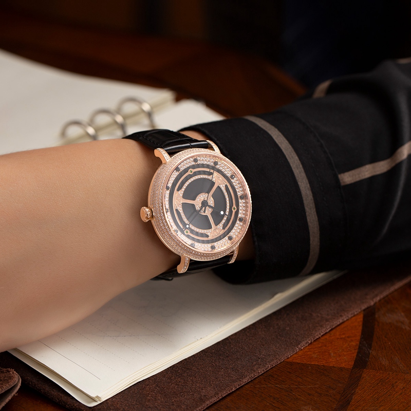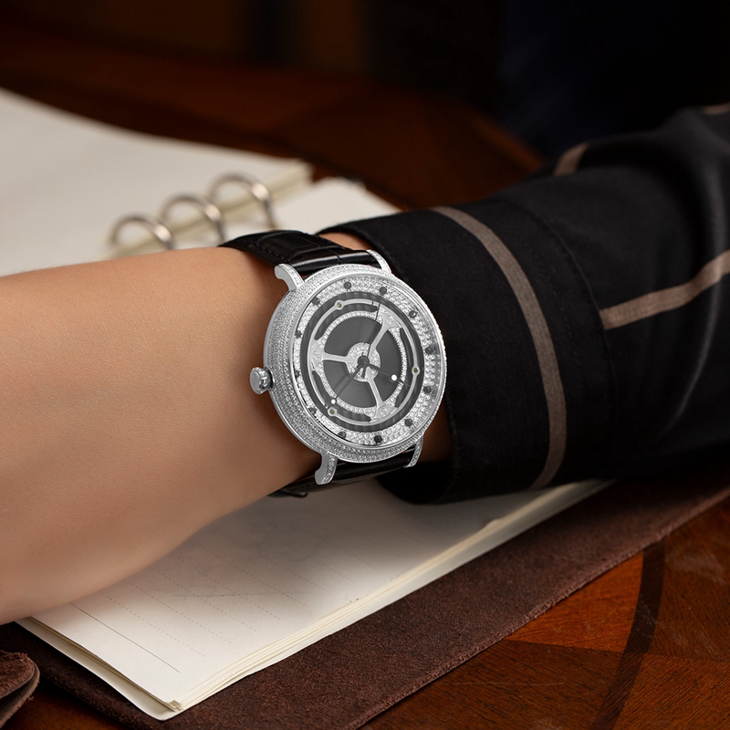 設(shè)計靈感結(jié)合了時來運轉(zhuǎn)的理念以及宇宙星象運轉(zhuǎn)的規(guī)律,創(chuàng)新地設(shè)計了360°可無限旋轉(zhuǎn)的表盤,并設(shè)計了以晶鉆鑲嵌的滿天星字面、暗合天地人三才思想的星圖字面,再輔以點綴其上的黑尖晶石、沙弗萊石,形成一副群星閃耀、光芒四射的宇宙星河美景,手腕抖動間表盤隨心轉(zhuǎn)動,為佩戴者帶來無限好遠(yuǎn)。
