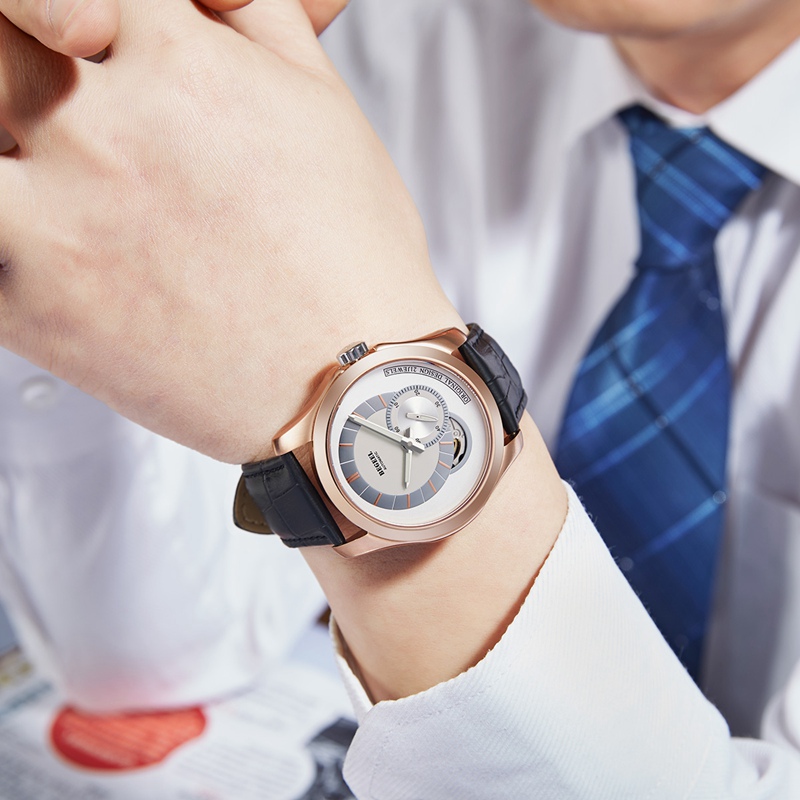 表盤設(shè)計(jì)整體由三個(gè)圓形疊加構(gòu)成,充滿韻律感,搭配淺雕工藝手工鏤雕而成的刻度,經(jīng)典三針立體劍型指針,底盤磨砂紋飾,輕奢質(zhì)感,整個(gè)表款充滿藝術(shù)感。