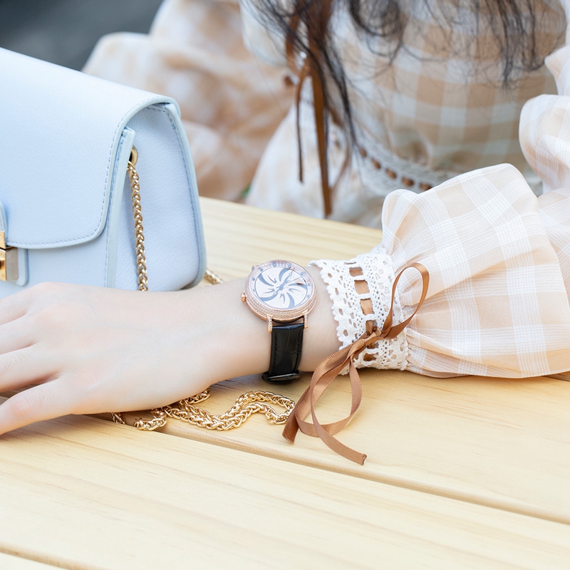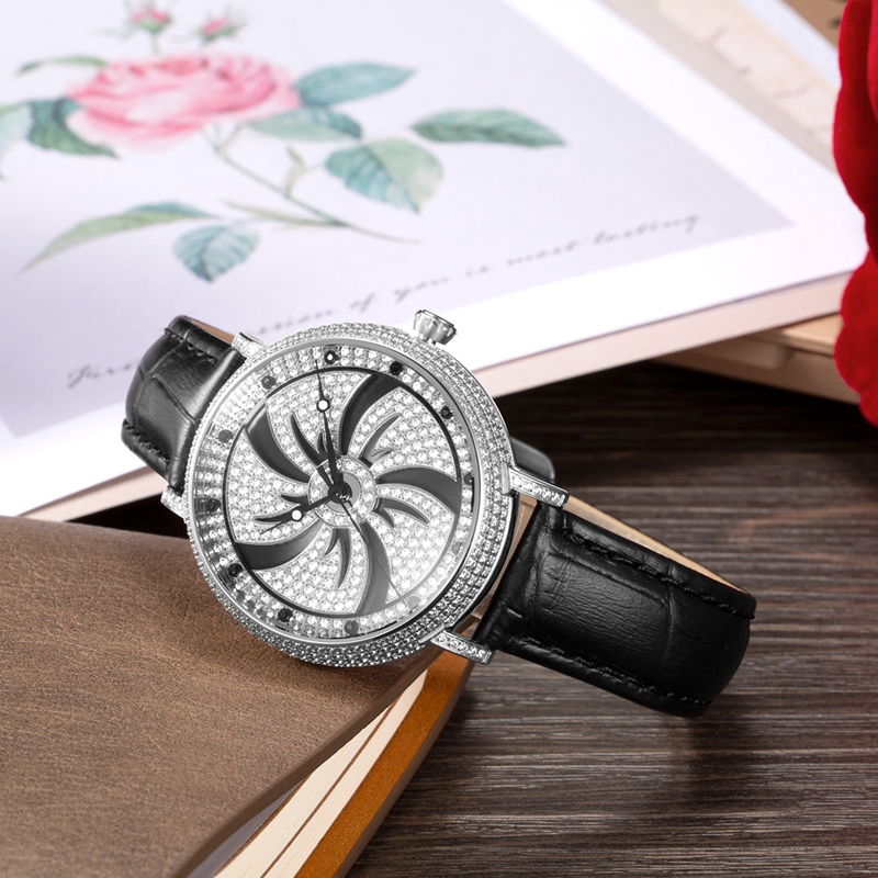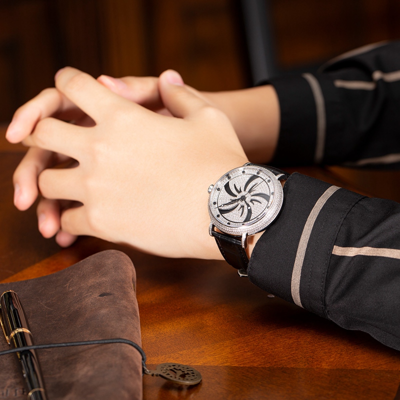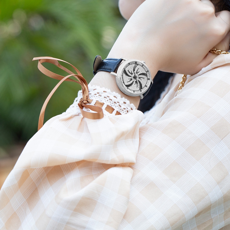 設(shè)計(jì)靈感結(jié)合了時(shí)來運(yùn)轉(zhuǎn)的理念以及宇宙星象運(yùn)轉(zhuǎn)的規(guī)律,創(chuàng)新地設(shè)計(jì)了360°可無限旋轉(zhuǎn)的表盤,并設(shè)計(jì)了以水鉆鑲嵌的滿天星字面、暗合天地人三才思想的星圖字面,再輔以點(diǎn)綴其上的天然黑尖晶石、沙弗萊石,形成一副群星閃耀、光芒四射的宇宙星河美景,手腕抖動(dòng)間表盤隨心轉(zhuǎn)動(dòng),為佩戴者帶來無限好遠(yuǎn)。