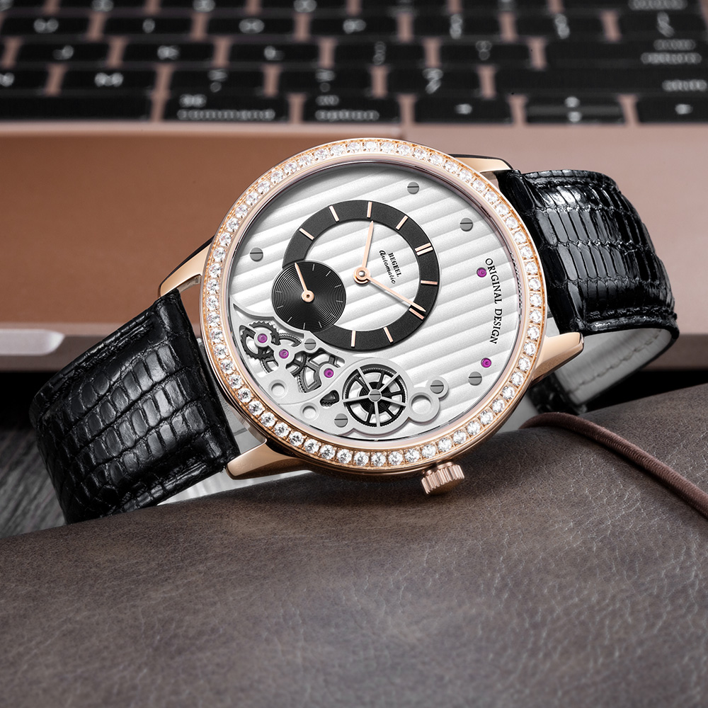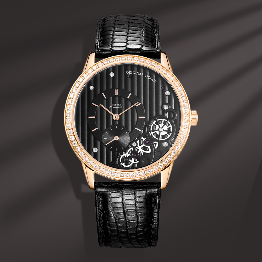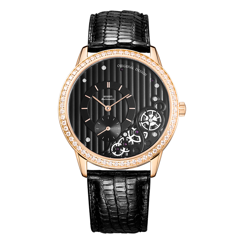 表殼:316L精鋼電鍍玫瑰金,圈口鑲60顆水鉆