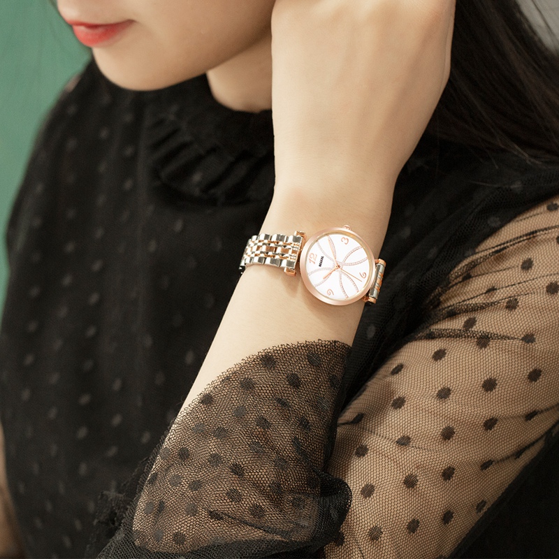 本款的字面設(shè)計靈感來源于風車,風車本身就是一道美麗的風景線欣賞,有自由無慮的意思,以此方向設(shè)計師在字面上鑲嵌112粒水鉆形成4條絲帶型弧線,組成風車圖案,光澤熠熠生輝,內(nèi)涵靜中有動。