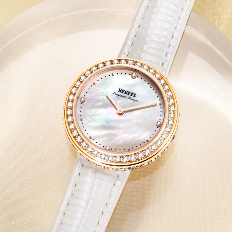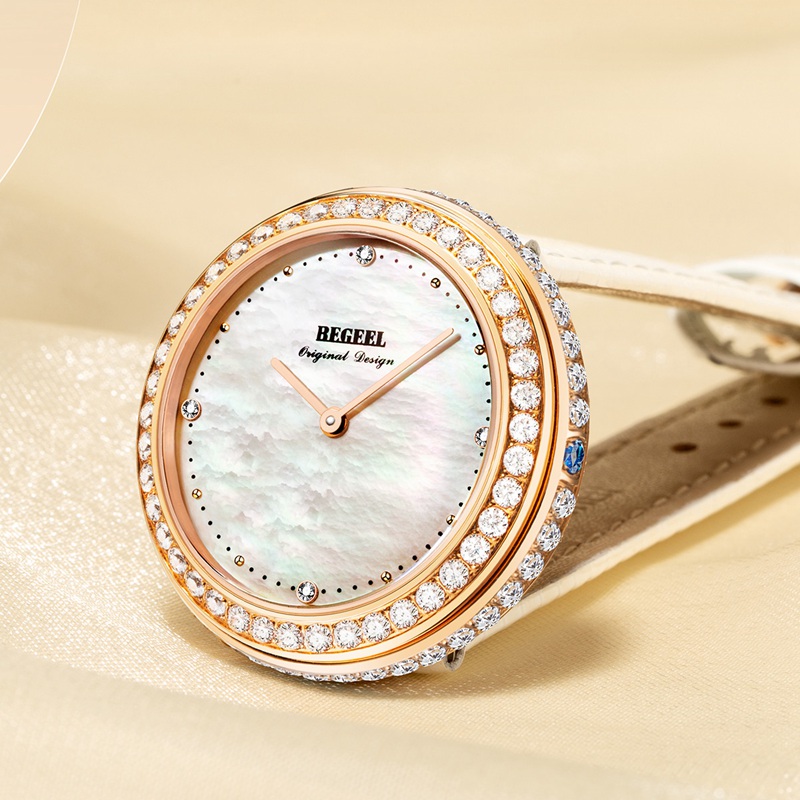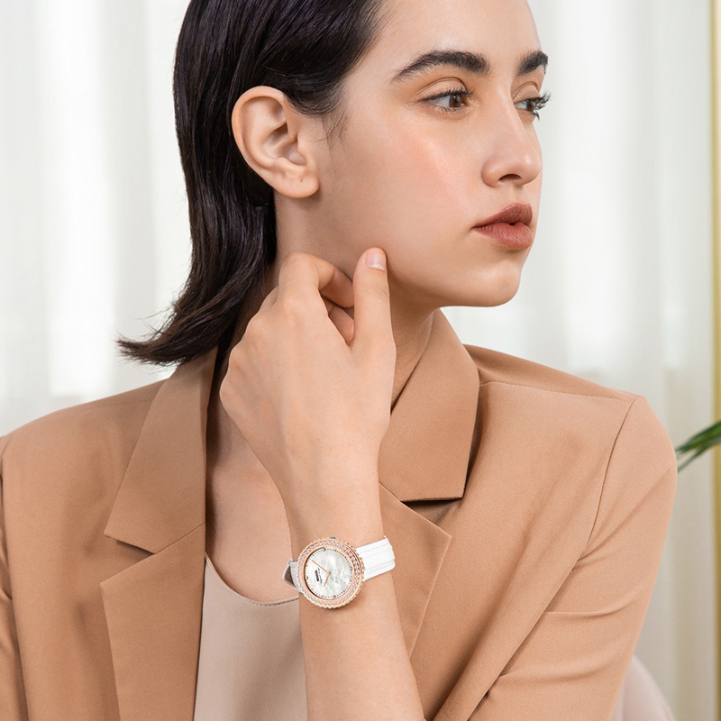 表殼:316L鋼 電鍍玫瑰金, 殼鑲鉆共108顆寶石(上圈口鑲42顆鋯石 中圈口鑲鋯石(44顆)/彩色寶石(18顆剛玉+4顆尖晶+22顆鋯石)底部鑲22顆鋯石)