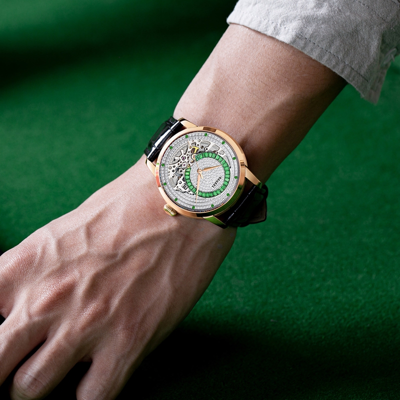 LEGEND·傳奇系列-見證者—腕表設(shè)計(jì)靈感來源于上海浦東世紀(jì)大道《東方之光》(日晷針)造型,它是以古代計(jì)時(shí)用日晷為原形,用不銹鋼管構(gòu)成錯(cuò)綜精致的網(wǎng)架結(jié)構(gòu),使這座垂直高度達(dá)20m的金屬雕塑,顯得既雄偉大氣,又通透靈秀;日晷令人聯(lián)想到遙遠(yuǎn)的歷史,旨在突出時(shí)間紀(jì)念的主題,設(shè)計(jì)師參考東方之光的造型,結(jié)合沙弗萊石等稀有原料,糅合到腕表的表盤設(shè)計(jì)之中,彰顯男士的尊貴風(fēng)范。