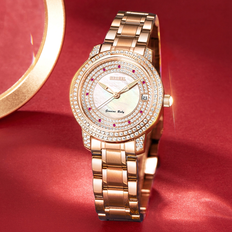 表殼:316L精鋼電鍍玫瑰金,鑲螺旋鉆圈口,鑲111顆晶鉆
