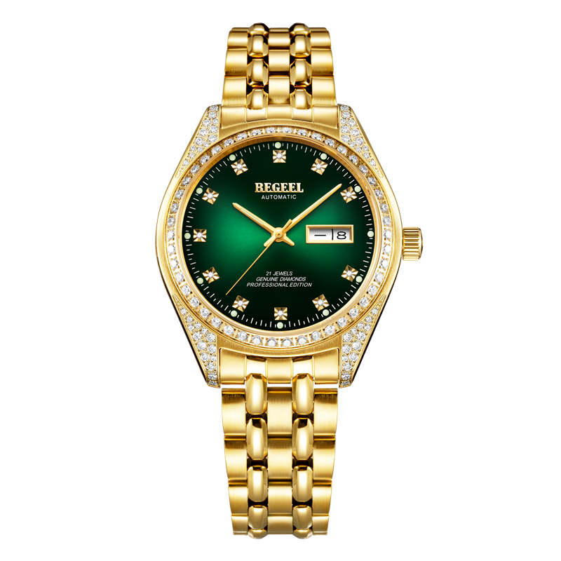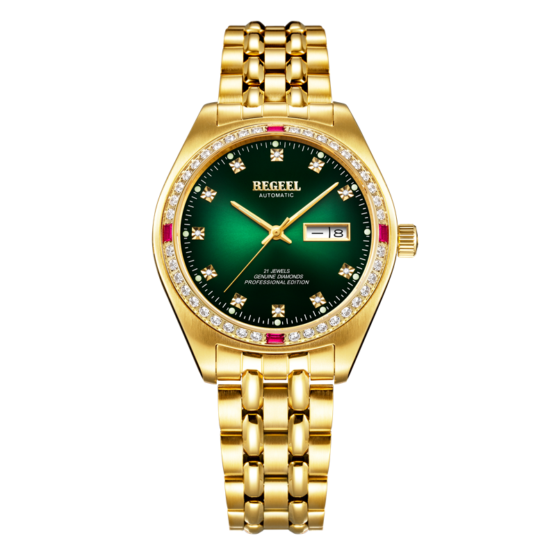 GOLDEN·流金系列-諾言— 來源于“金科玉律”的成語概念:必須遵守,不能變更的守則。恪守信念是一個人應(yīng)具備的優(yōu)秀品質(zhì)之一,所以在本款手表的設(shè)計過程中,通過外形的設(shè)計諧音成語發(fā)音,來傳導(dǎo)這種理念,金色的表殼,如玉般墨綠的字面,金殼玉綠諧音金科玉律,讓佩戴者戴上這款表能謹(jǐn)守心中的諾言。