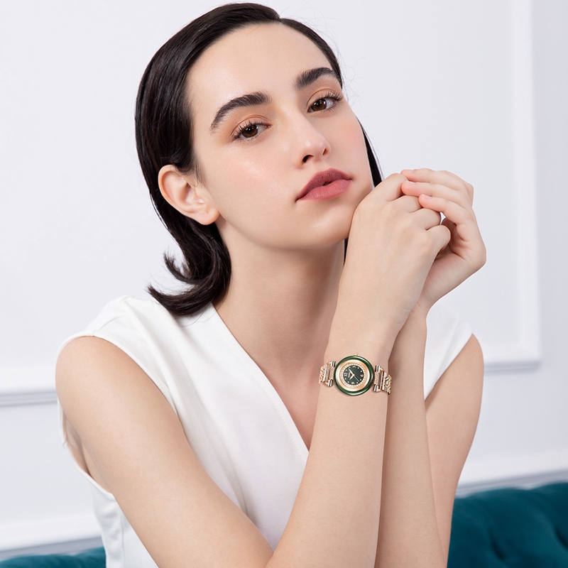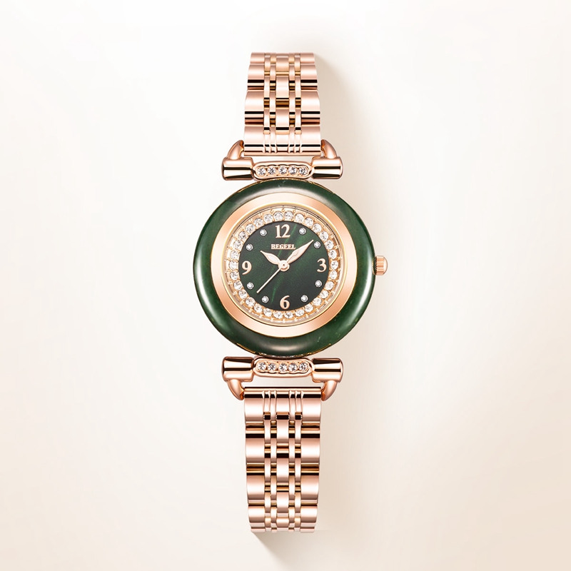 表殼:墨綠和田玉圈,電鍍玫瑰金,鑲嵌40顆晶鉆