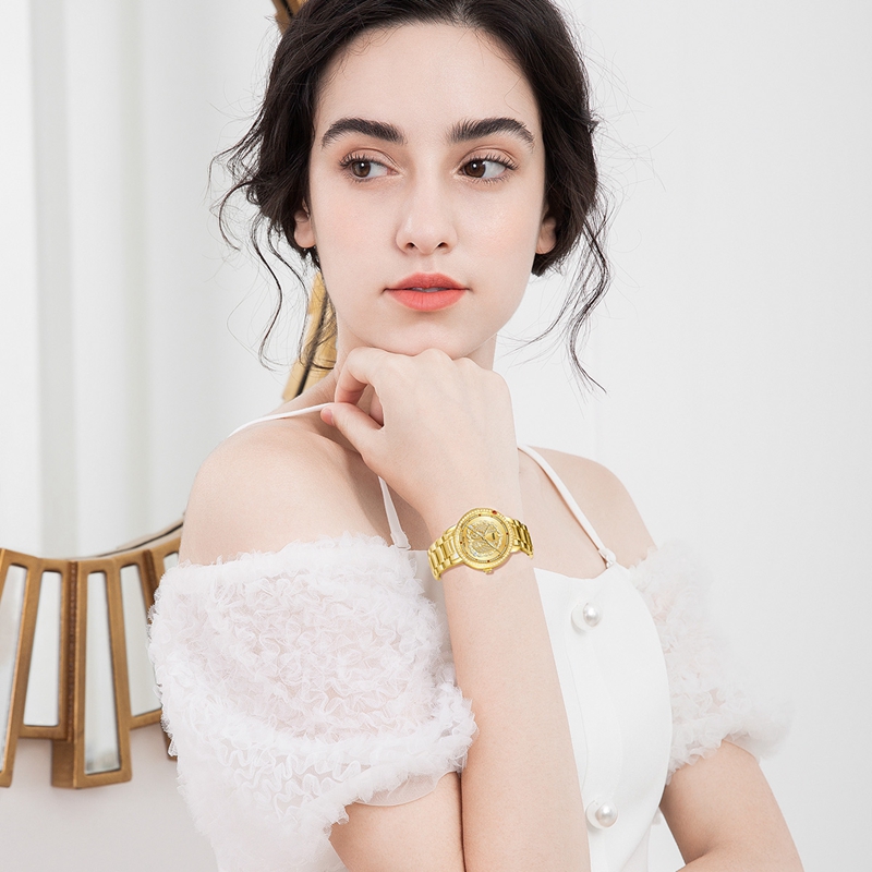 表殼:316L精鋼電鍍金,鑲57顆晶鉆,1顆合成大紅寶石