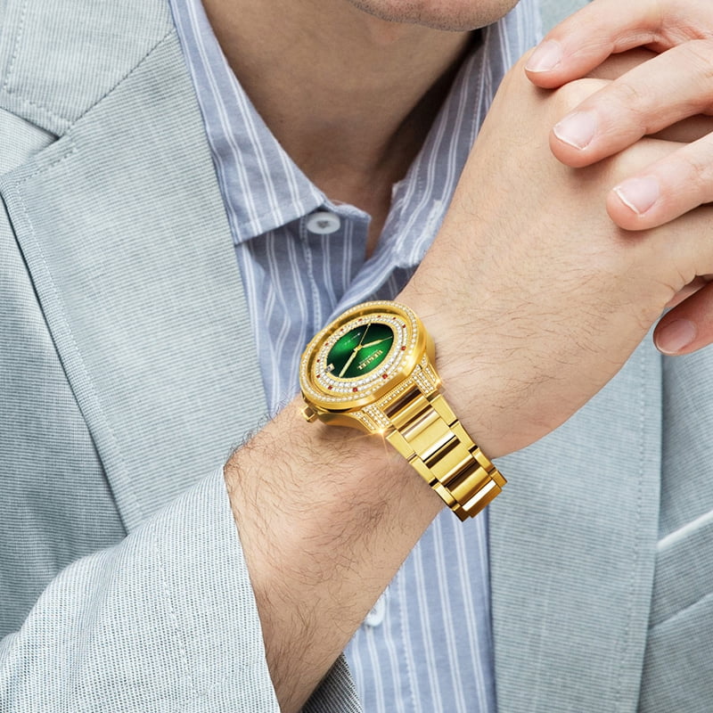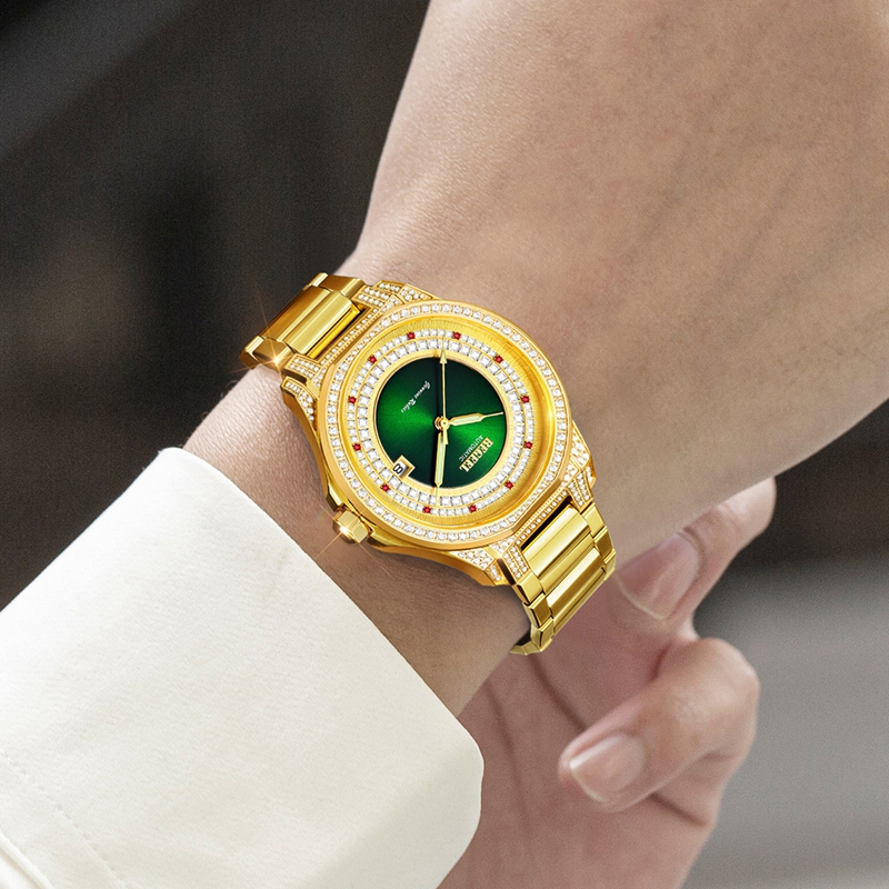 字面:雙紋理,金色流沙紋和綠色太陽紋,鑲約105顆方晶鉆,12顆真紅寶石 約0.012ct, 強(qiáng)夜光針