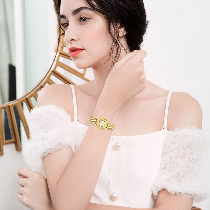 DREAM·夢想系列-小玲瓏— 嫵媚柔情生凈土,玲瓏倩影競凡華,設(shè)計師在表殼上進行了細膩的雕花處理,層次感十足,電鍍真金工藝打造,盡顯女性優(yōu)雅魅力。