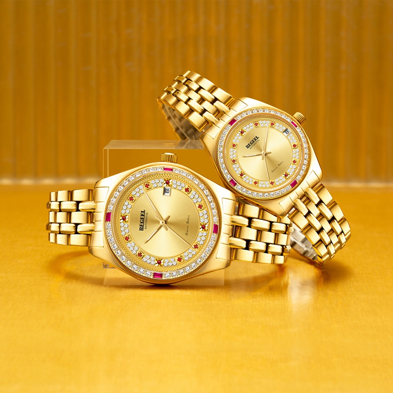 表殼:316L精鋼+電鍍真金,男款鑲44顆晶鉆;女款鑲40顆晶鉆