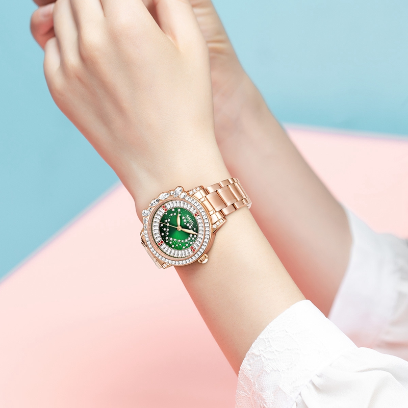表殼:316L精鋼+電鍍真玫瑰金,圈口鑲59顆晶鉆