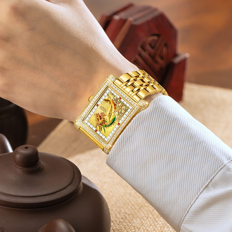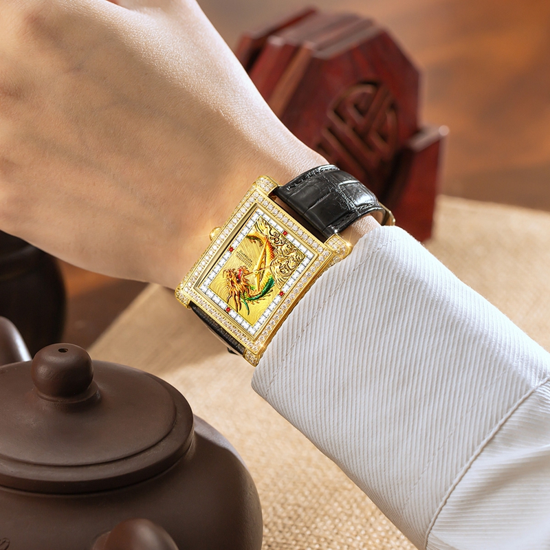 字面:電鍍青龍面, 雙紋理設(shè)計(jì)海浪和風(fēng)紋+鑲36顆晶鉆方石+4顆真紅寶石