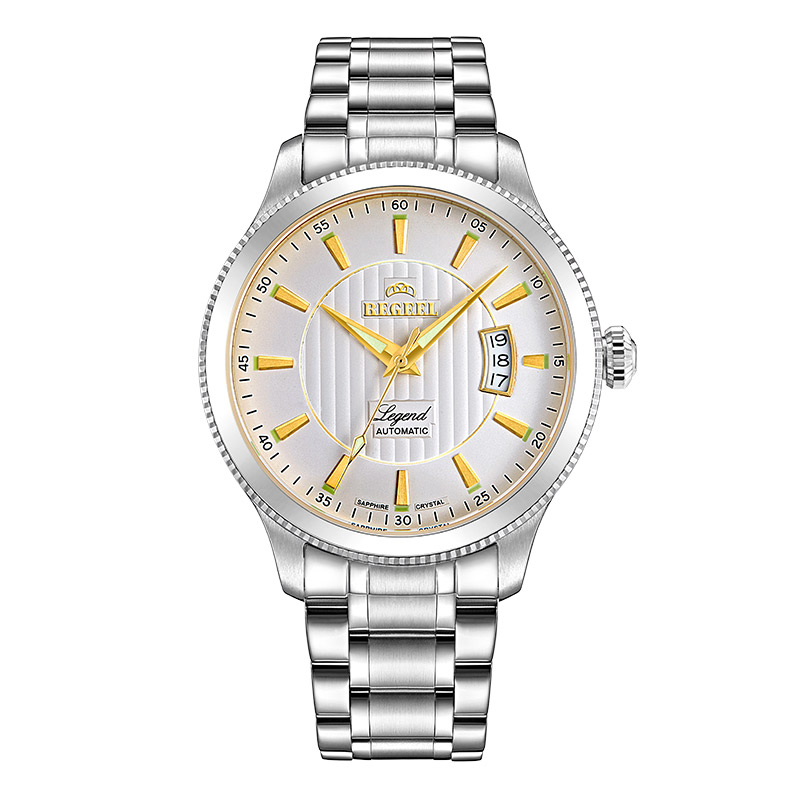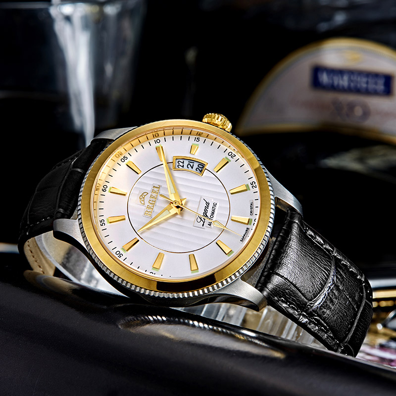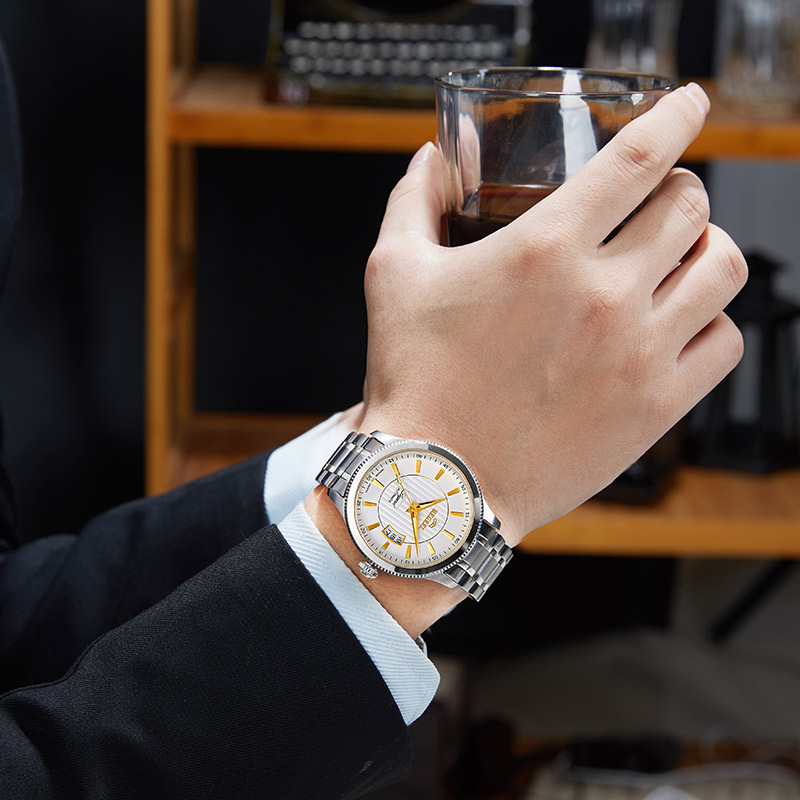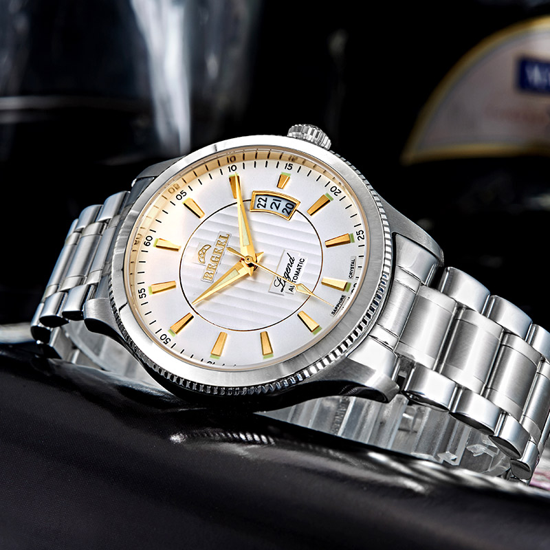 設計師延續(xù)了賓爵一貫簡約優(yōu)雅的風格特色,以現(xiàn)代的手法展現(xiàn)別樣的經(jīng)典味道,古典圓形輪廓邊緣飾以富有工業(yè)特色的銀色齒輪紋,白色表盤中央采用時下流行的條紋元素裝飾,與立體金釘刻度、金色太子妃指針相輔相成,簡約中蘊含格調(diào),細節(jié)處彰顯品味。