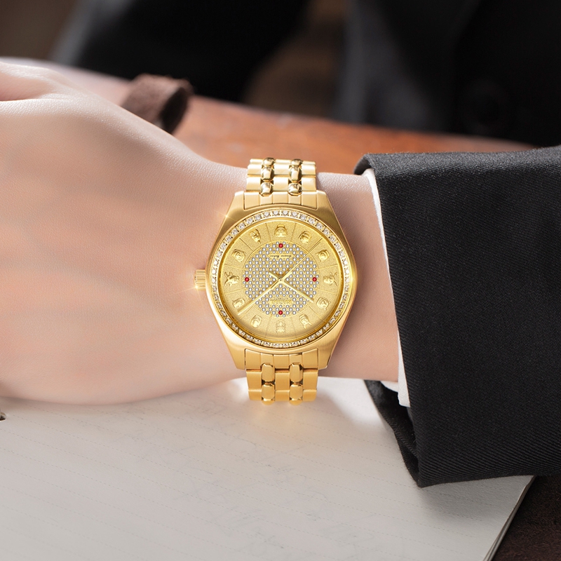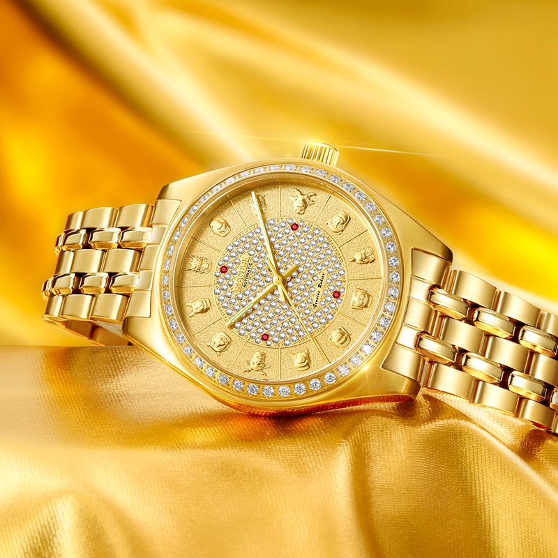 字面:鑲4顆真紅寶石,磨砂金面,刻度位雕刻12生肖電鍍真金,夜光指針,鑲約173顆晶鉆