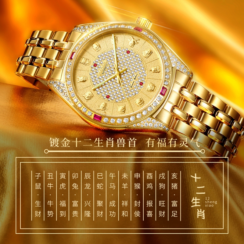 字面:鑲4顆真紅寶石,磨砂金面,刻度位雕刻12生肖電鍍真金,夜光指針,鑲約173顆晶鉆