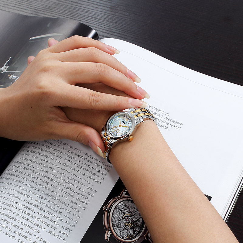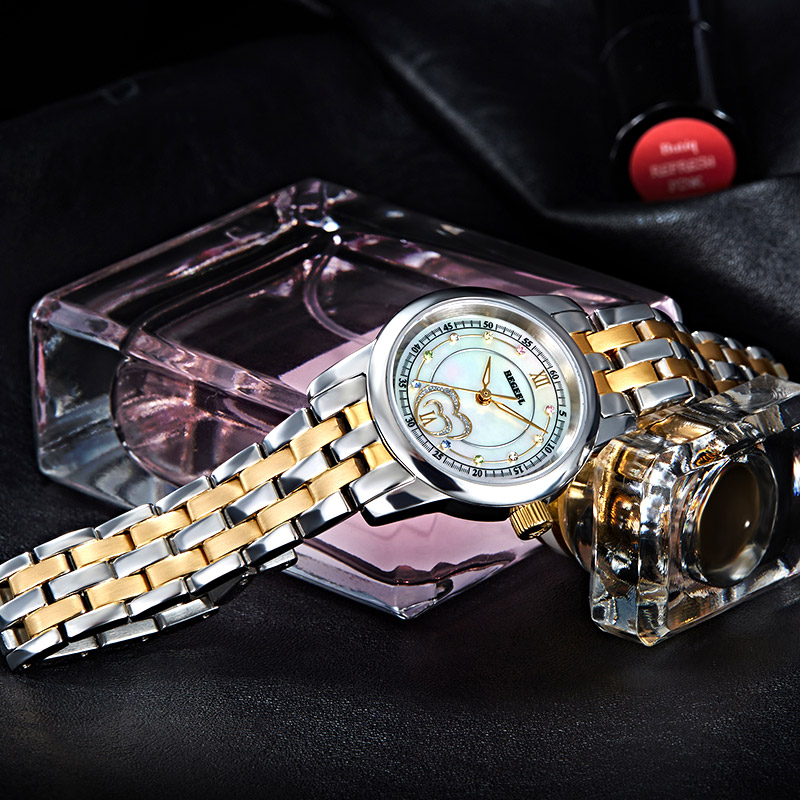 設(shè)計(jì)理念源自一首情詩“身無彩鳳雙飛翼,心有靈犀一點(diǎn)通”,男女表表盤上均雕刻一對(duì)閃耀的金色弧線,仿佛那雙飛的比翼鳥,張開翅膀飛向碧藍(lán)的天空而劃開兩道美麗的弧線,金色弧線上分別綴鑲5顆閃亮晶鉆,合計(jì)十顆,它印刻愛情的初始,它閃耀愛情的永恒。男表表盤中心鐫刻四道弧形聲波從中心向外擴(kuò)散,取自超聲波的圖形,寓意著心底的愛意化作聲波傳遞到你心底;女表6點(diǎn)位兩個(gè)心形相互串聯(lián),寓意著情人間兩顆漸漸靠近的心,兩心相惜,兩心相知,直至心有靈犀。賓爵臻愛心聲石英情侶表,擷取愛情中最浪漫的元素,鐫刻表盤,愿天下有情人終成眷屬,在時(shí)光中見證愛的永恒。