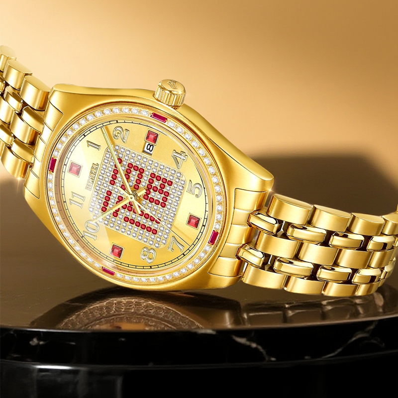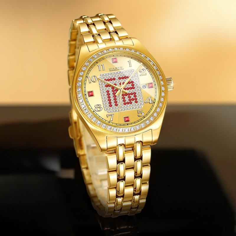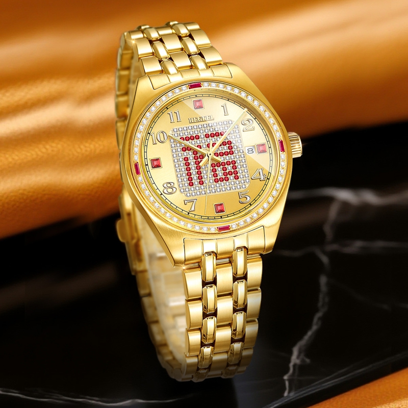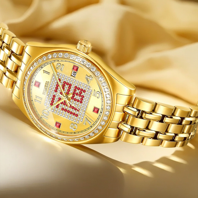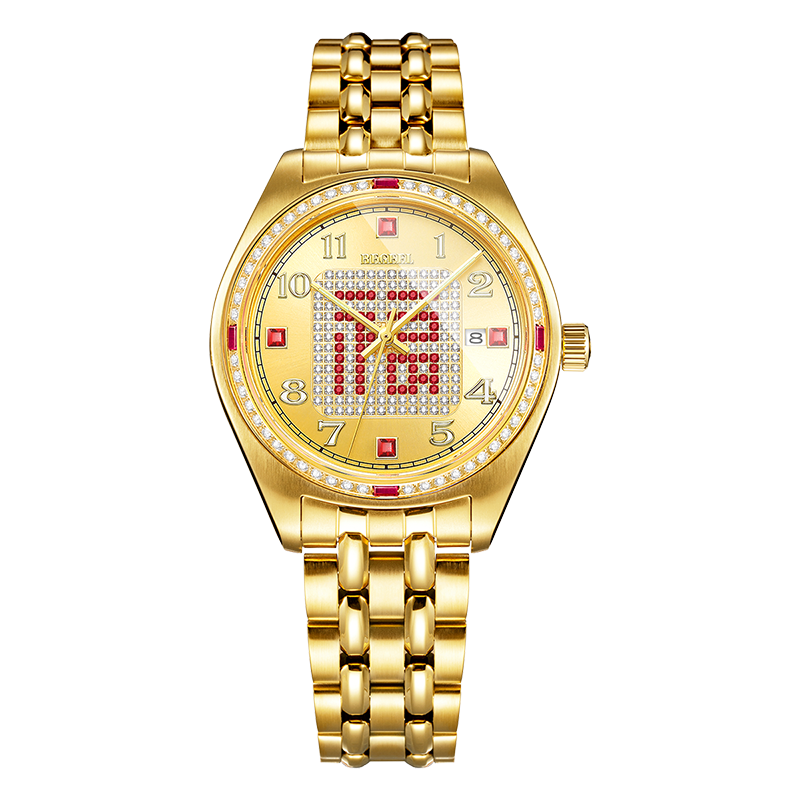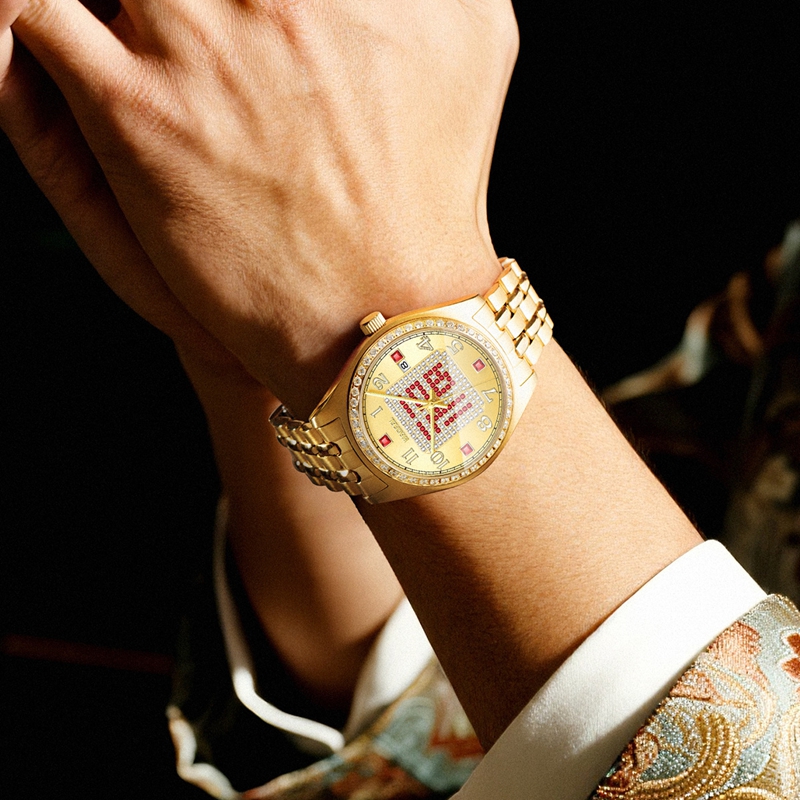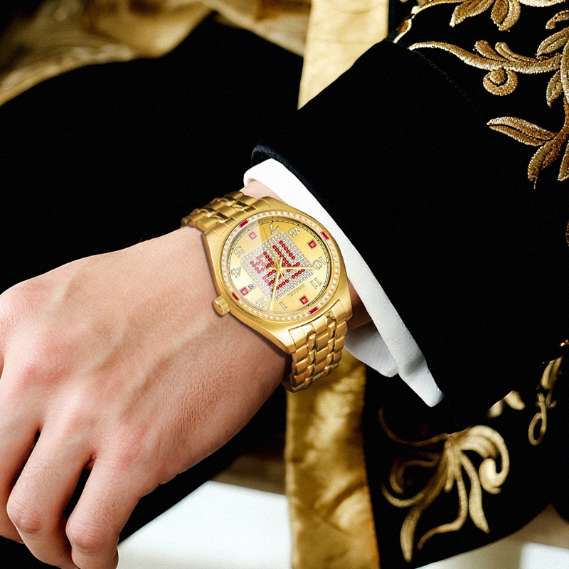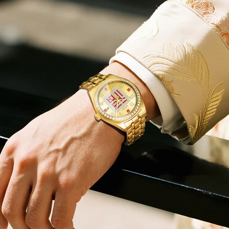 字面:太陽(yáng)紋金面,滿天星紅福字,鑲2顆真紅寶石,52顆合成紅寶石,4顆合成紅寶石方石,132顆晶鉆,夜光阿拉伯?dāng)?shù)字,夜光指針