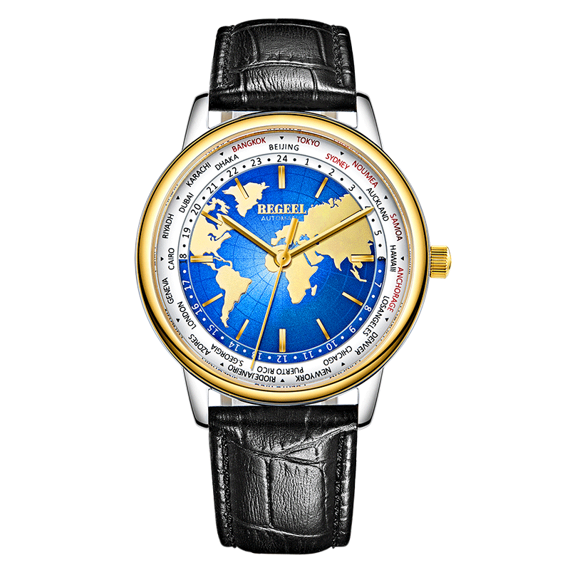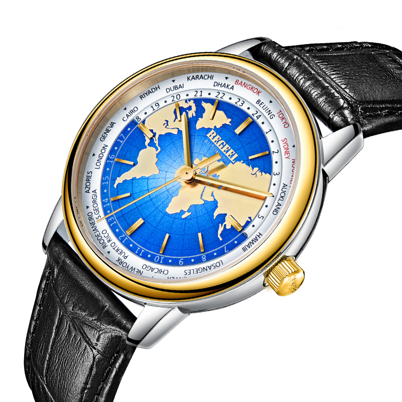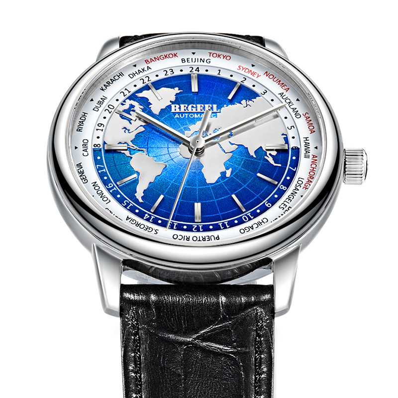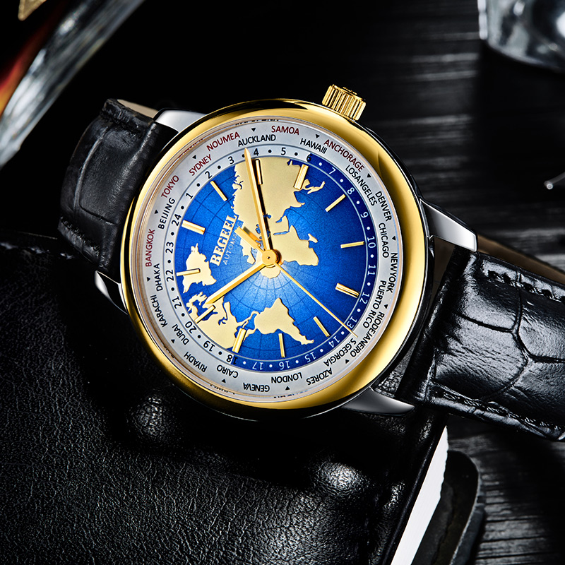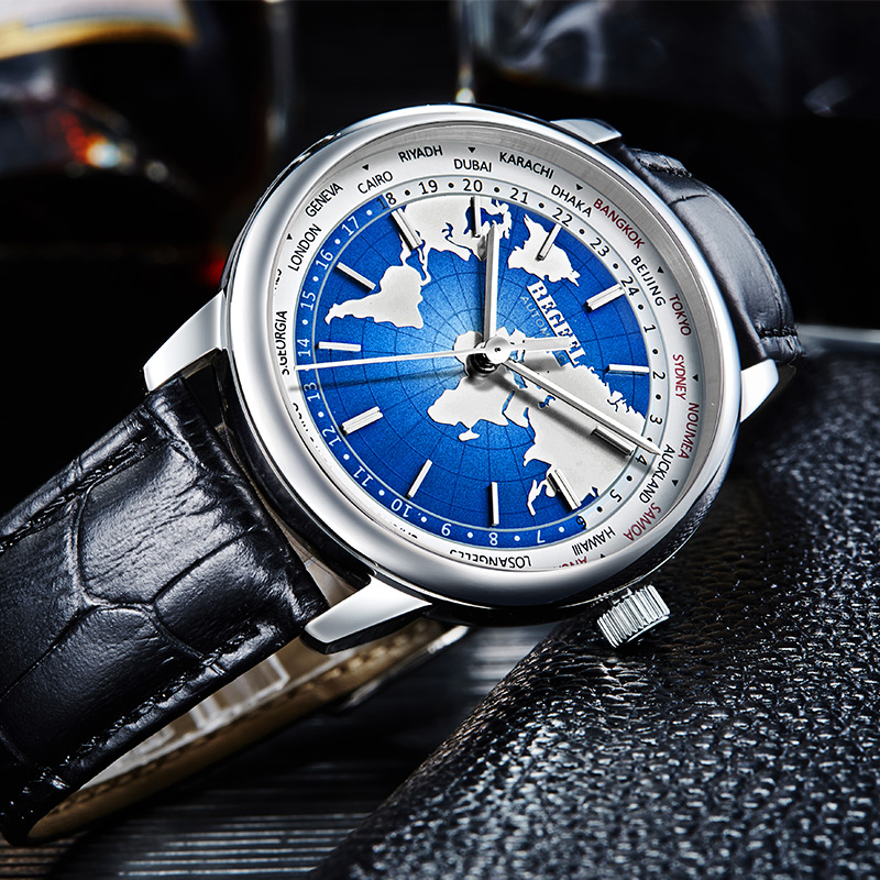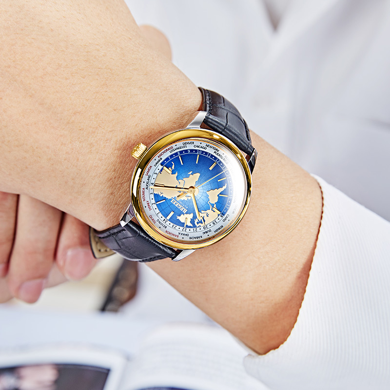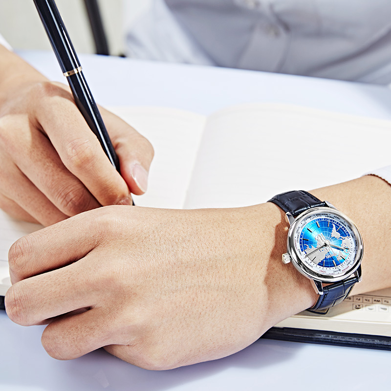 賓爵首款世界時區(qū)腕表。24小時制表盤,外緣標注全球24個時區(qū)主要城市英文名稱,表盤中間彩印世界地圖,藍色海洋中五大洲輪廓清晰可見,似遠還近,就如一份踏上旅途的邀約,整體層次豐富而不繁復,精致大氣。只要確定標準時間,便可同時讀取世界上二十四個時區(qū)代表城市時間,實用性強,適合差旅人士佩戴。